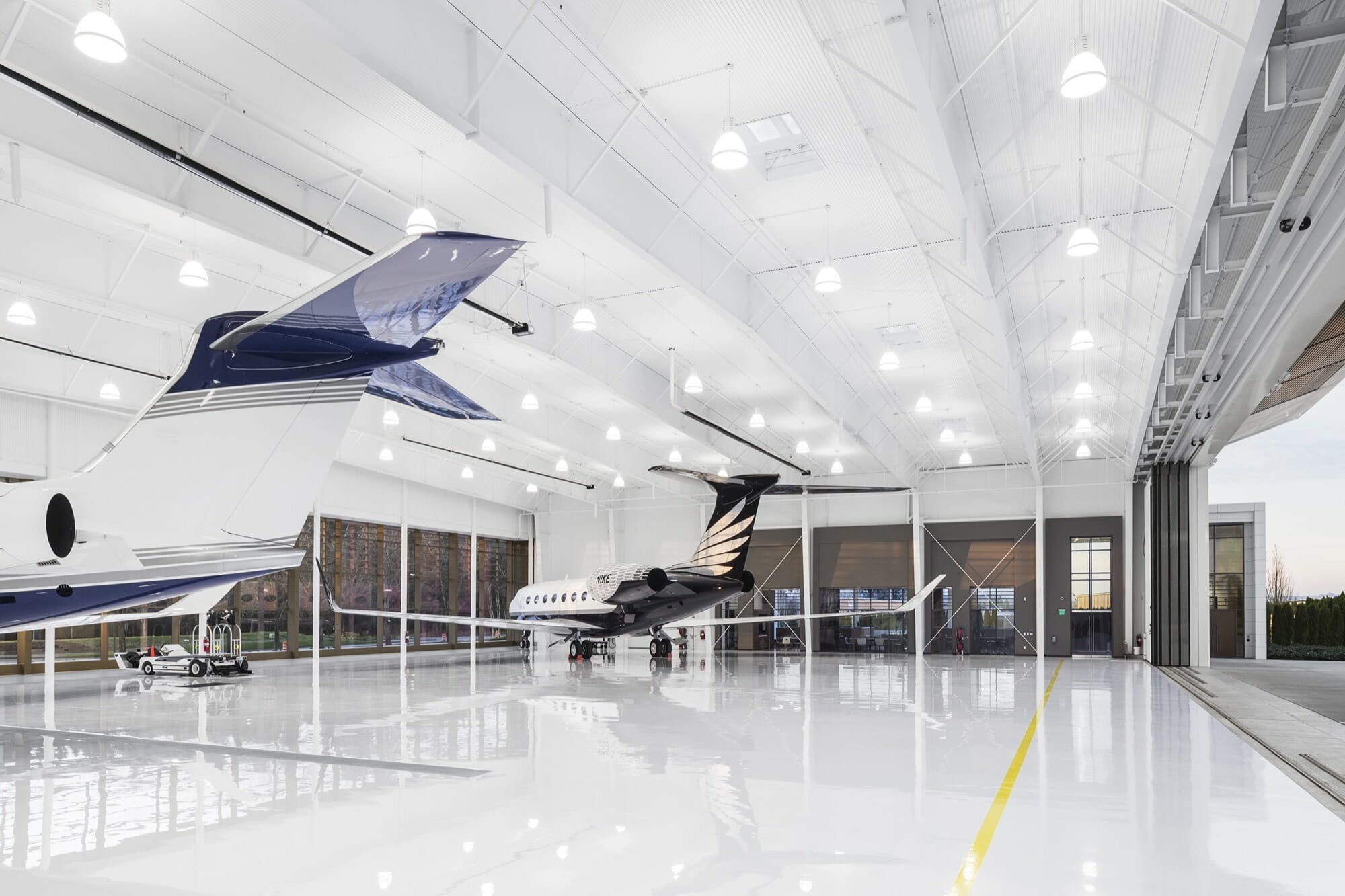 Located at the Hillsboro Airport, this contemporary aircraft hangar provides both administrative functions and maintenance facilities to house the owner’s private fleet of planes. The facility is capable of storing three, full-size business jets and is designed to showcase the planes, which are each graphically unique. OEG scope included LED Lighting throughout, as well as new low-voltage lighting controls. Included a backup inverter for lighting.